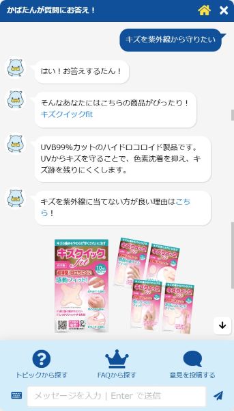 そこで、問い合わせ対応しながら情報収集できる仕組みとして、ECサイト『ばんそうこう屋』に『さっとFAQ』を設置するのがベストと考え、ご提案しました。