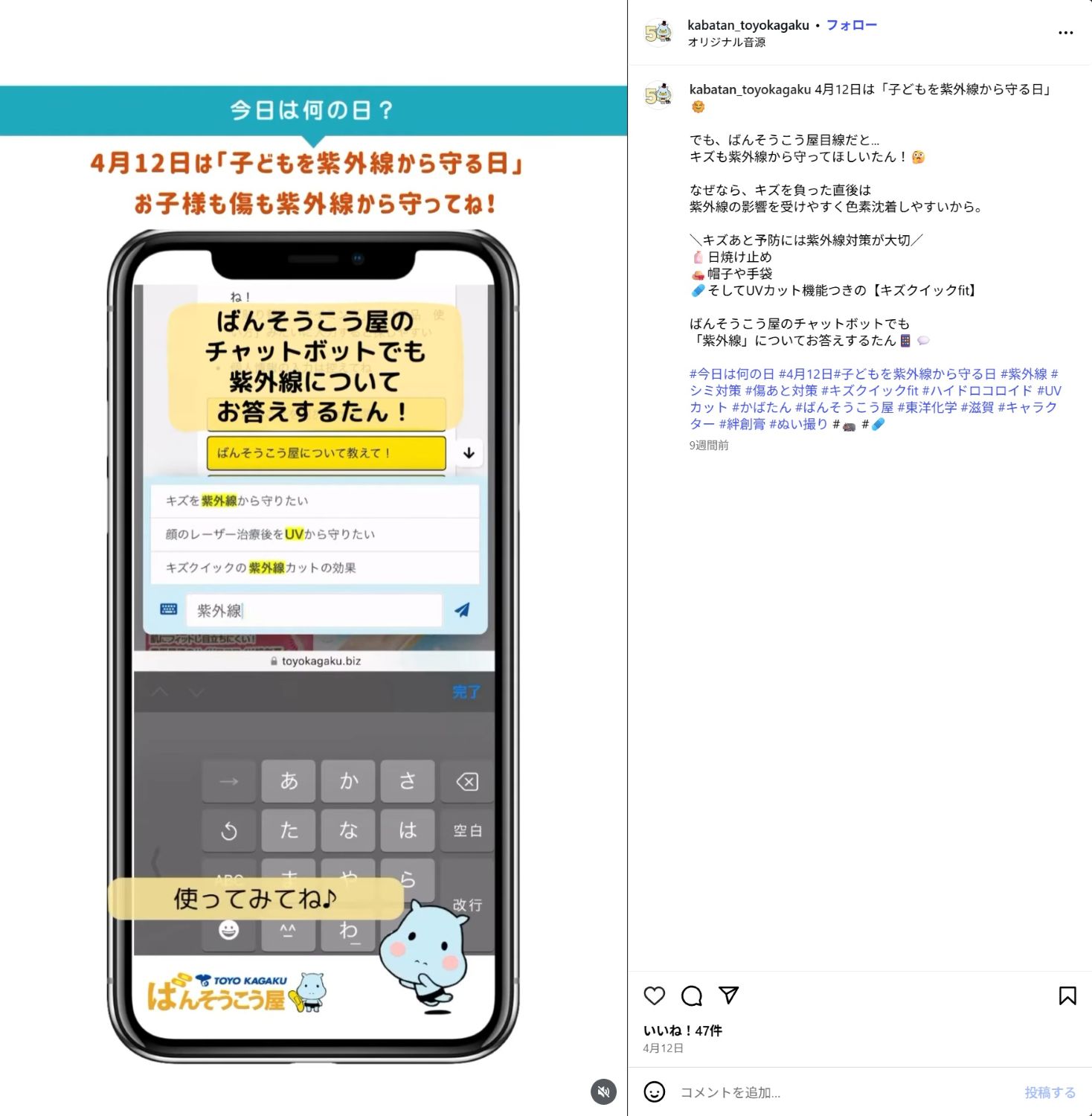 実際にあった例ですと『さっとFAQ』の「チャット履歴」の中から「紫外線」について質問されていたことを知り、その質問内容を参考にして、Instagramで「紫外線」について投稿します。