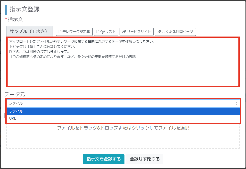 指示文を入力してからQAデータの元となるファイルもしくはURLを選択し、QAデータを生成します。