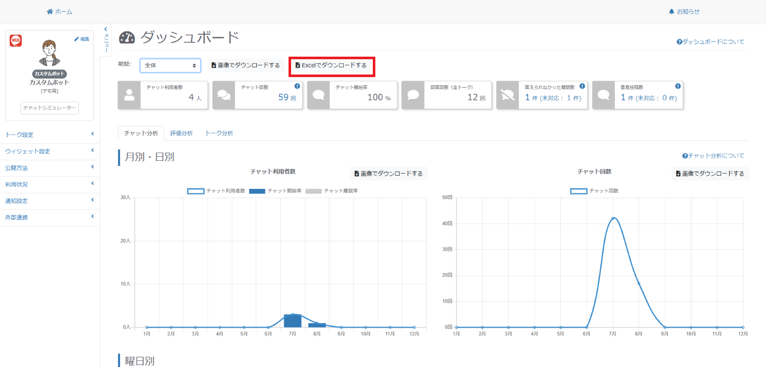このボタンを押下することで、現在表示しているタブの集計項目やグラフ内の値を全てExcel形式で出力することができます。