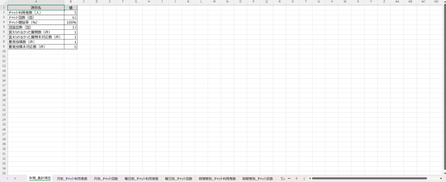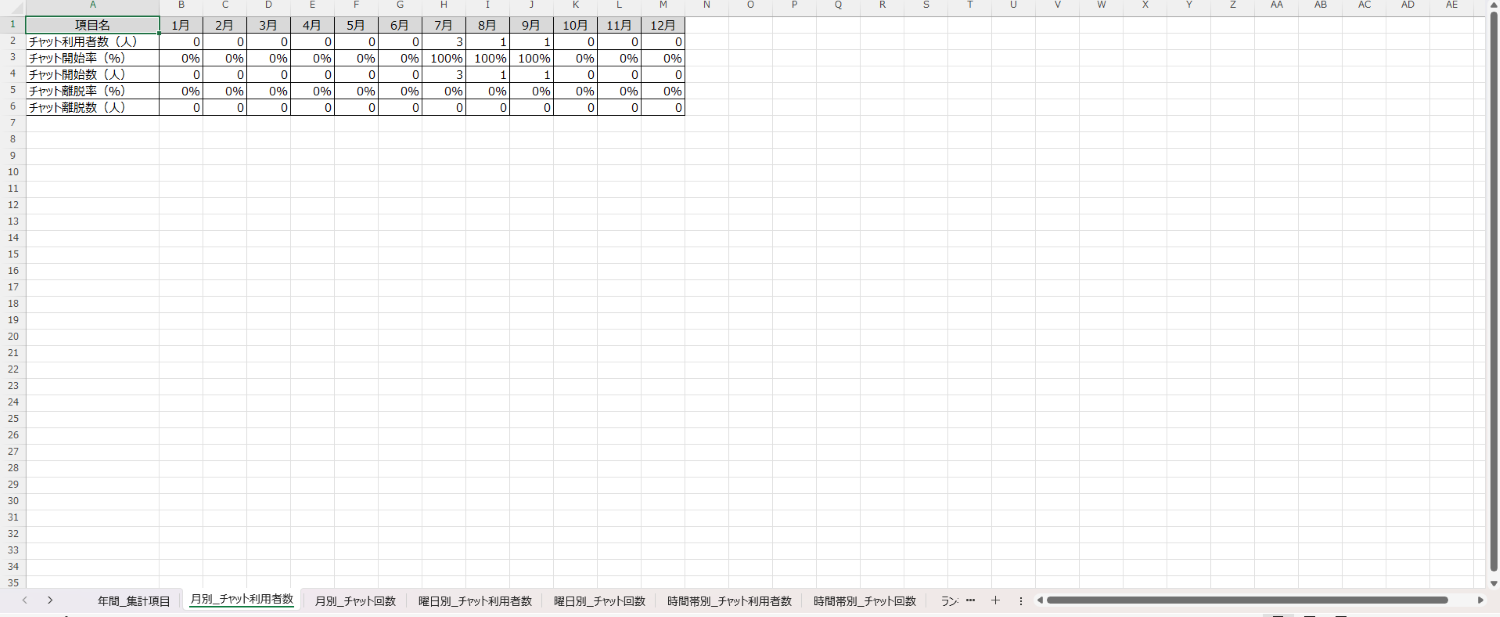 【チャット分析タブを出力したExcelファイル:集計項目】
